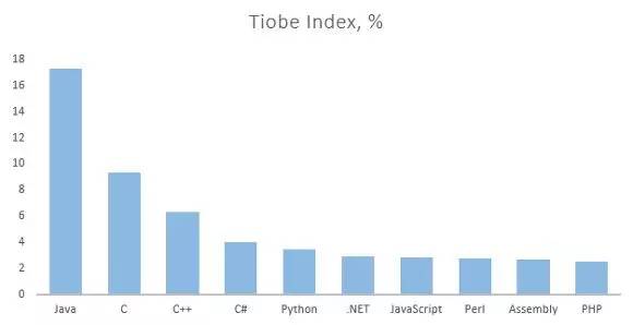 TIOBE编程社区排名则每月更新一次。其参考标准基于主流搜索引擎之上全球各地相关软件工程师、课程及第三方厂商的具体数量。位列第一的是Java,谷歌的Go语言则成为上升速度最快的选手,一年内增长了2.16%。Awk、Alice与VHDL则以略高于0.2%的占比作为前五十名的守门员。