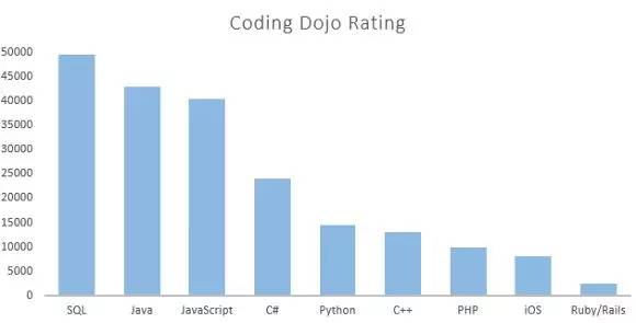 Coding Dojo给出的数据汇总同样基于求职网站Indeed.com。根据其结果,雇主们最为需要的九大编程语言分别为(按先后次序排名)SQL、Java、JavaScript、C#、C++、Python、PHP、Ruby on Rails以及iOS/Swift。