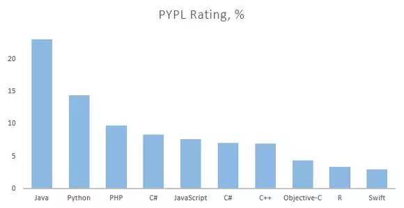 PYPL(编程语言人气Y)排名基于谷歌搜索给出的语言教程数量。其结果非常简单:语言教程搜索数量越高,语言就越受欢迎。根据这一统计,Java为目前最为热门的语言,JavaScript的提升速度则最快,Python在过去五年内涨幅最大(2.7%)。PHP的下降趋势则最明显(-4.7%)。