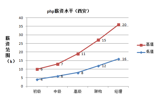 目前,西安的PHPer按级别划分薪资范围如上图,4k-20k没有涉及到总监以上级别(原因是这个阶段的已经是大牛级别了,语言层面已经不是最关键,更考中的是管理和规划的能力)