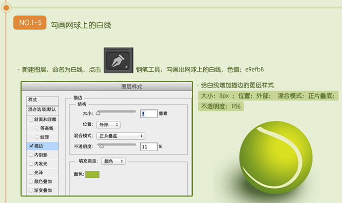 勾画网球上的白线。新建图层,命名为白线,点击钢笔工具,勾画出网球上的白线,色值:e9efb8