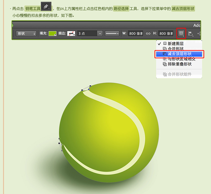 再点击钢笔工具,在ps上方属性栏上点击红色框内的路径选择 工具,选择下拉菜单中的 减去顶层形状。