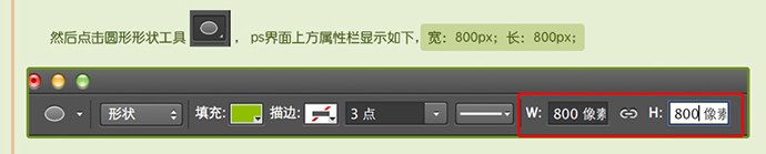 然后点击圆形形状工具 , ps界面上方属性栏显示如下,宽:800px;长:800px;