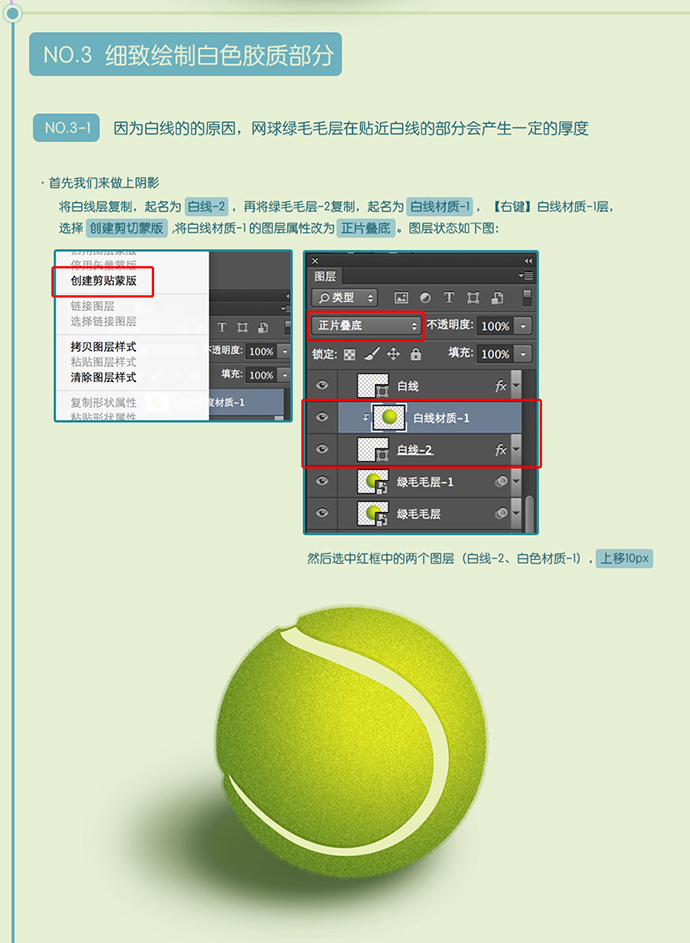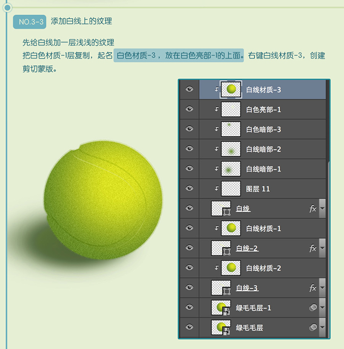 先给白线加一层浅浅的纹理,把白色材质-1层复制,起名白色材质-3,放在白色亮部-1的上面。右键白线材质-3,创建剪切蒙版。