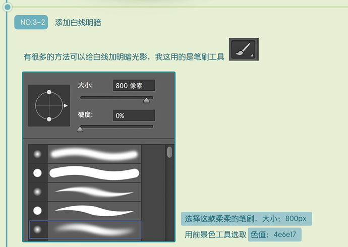 有很多的方法可以给白线加明暗光影,我这用的是笔刷工具。选择这款柔柔的笔刷,大小:800px ; 用前景色工具选取 , 色值:4e6e17