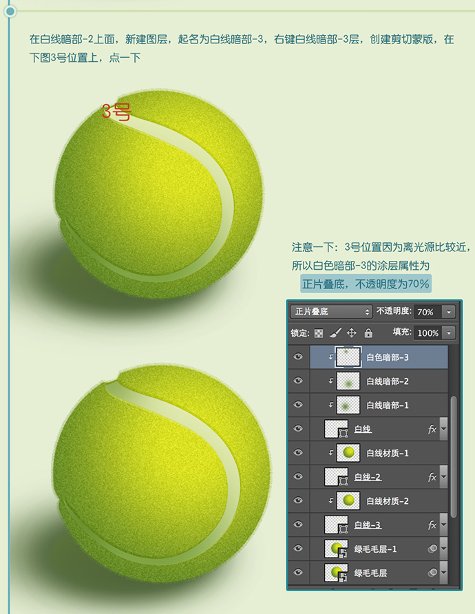 注意一下:3号位置因为离光源比较近,所以白色暗部-3的涂层属性为正片叠底,不透明度为70%。