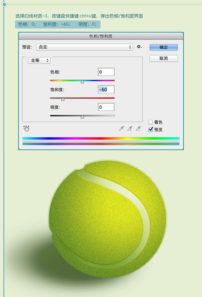 为绿毛毛层添加图层样式,使用颜色渐变,绘制出网球大概的体感,光感。