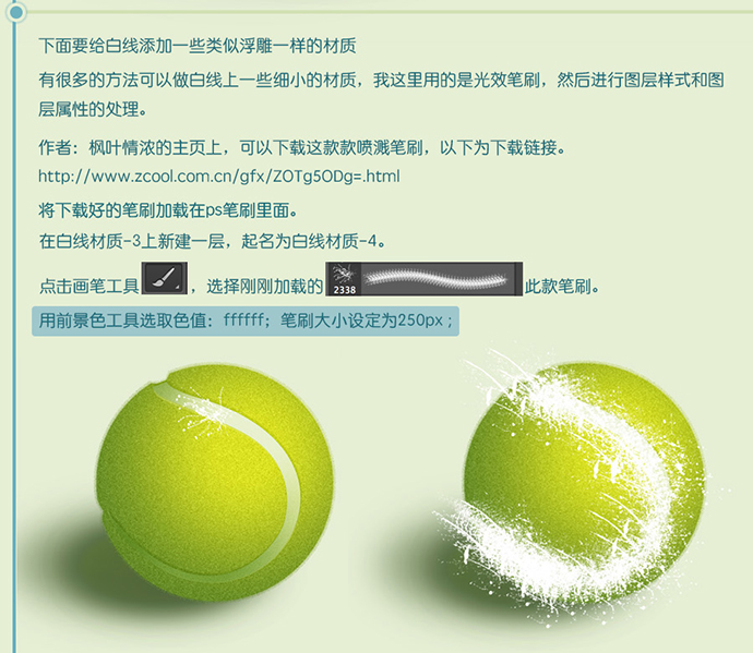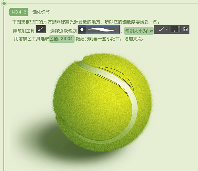 下图黑框里面的地方是网球离光源最近的地方,所以它的细致度要增强一些。用笔刷工具,选择这款笔刷,笔刷大小为1px , 用前景色工具选取色值:f3fb04 ,细细的刻画一些小细节,增加亮点。