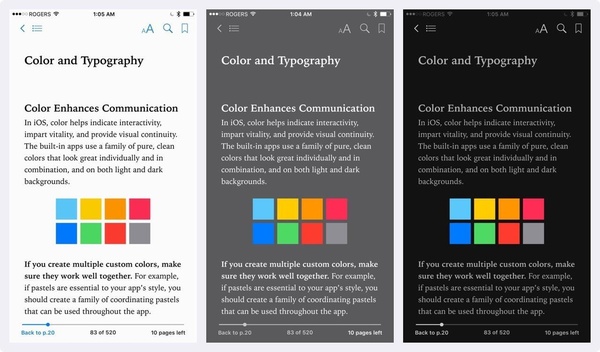 在一些情况下,你需要根据品牌或可用性来权衡UI的明暗。比如iBook的应用中,当外界环境变得昏暗时,它会自动切换到暗色的阅读模式。