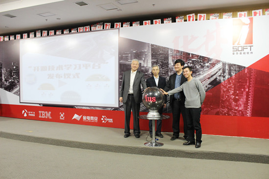 补充说明:照片中四人从左到右分别是:普华基础软件总经理赵晓亮、中国工程院院士倪光南、云和数据公司总经理郭凯和百度开放云副总经理周保玉。