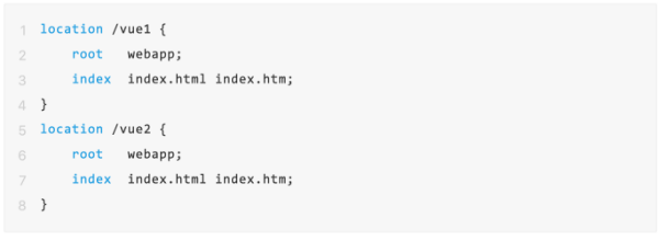 分别在vue项目根目录中使用命令npm run build创建输出文件,将dist文件夹下的所有内容复制到nginx目录下的webapp/vue1和webapp/vue2内(没有的话自行创建)。