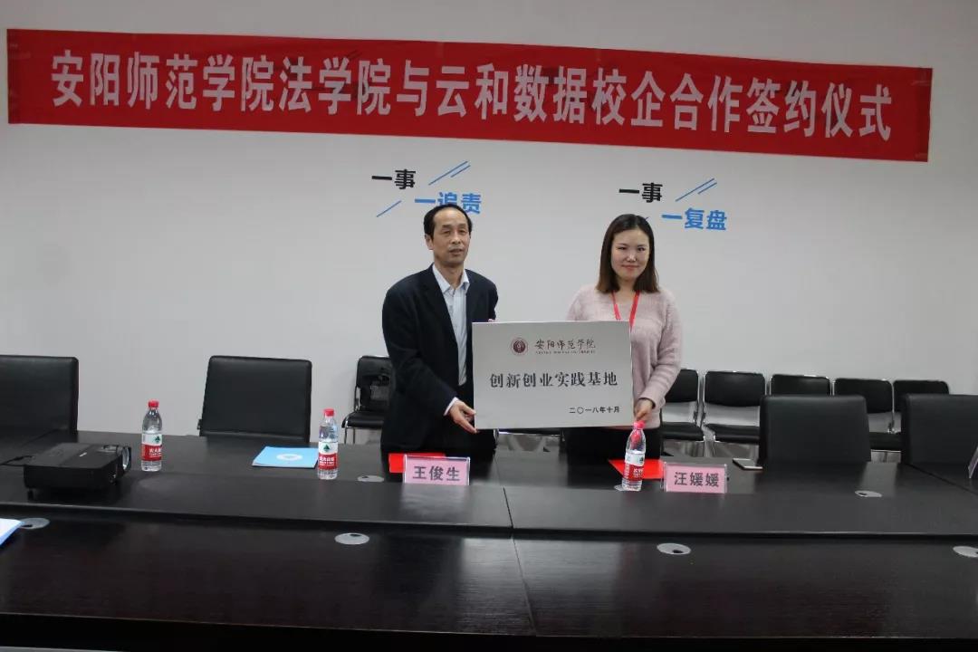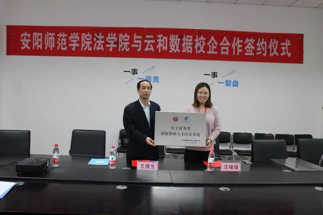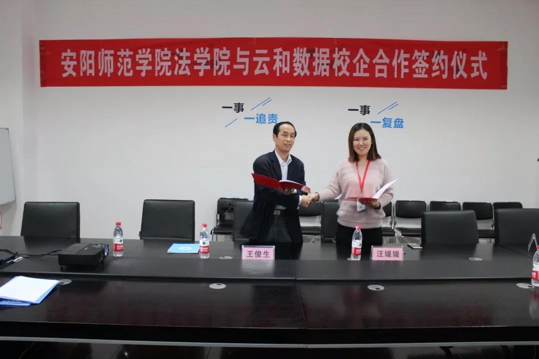 为进一步深入贯彻落实习主席新时代特色社会主义战略思想和十九大会议相关精神,进一步深化校企合作领域,为区域经济社会发展提供更优质的人才支撑。10月25日下午,安阳师范学院法学院党委书记王俊生携电子商务及法律专业教研室主任胡伟、谷景志老师一行莅临云和数据出席安阳师范学院&云和数据校企合作签约。