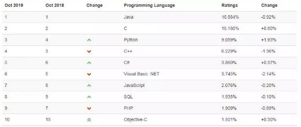 近日,TIOBE编程语言排行榜10月份的榜单公布,排名前十的分别是:Java,C,Python,C++,C#,Visual Basic.NET,JavaScript,SQL,PHP,Objective-C。