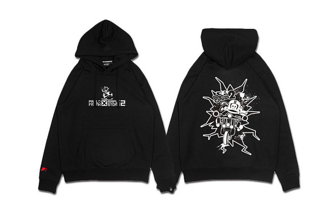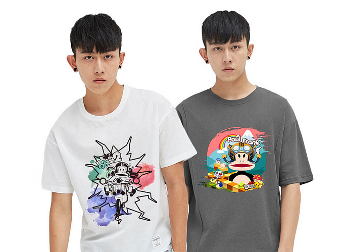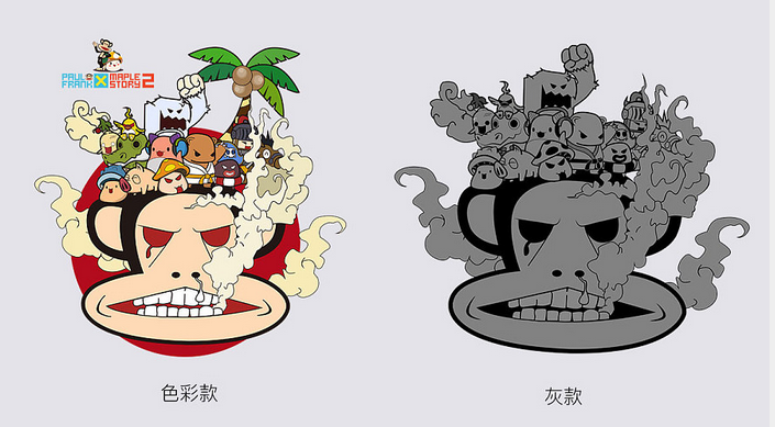 这次作品本着简单主义风格进行创作,原本想着如果图案上的颜色太艳的画,就会给人一种“乱花渐欲迷人眼”的感觉,故此次采取黑白简单风格来对衣服图案作画。虽不上“阳春白雪”,但也怀有一番趣味在其中。大嘴猴表情之夸张,冒险岛人物姿态之迥异,二者上下,对冒险精神的另一种诠释。